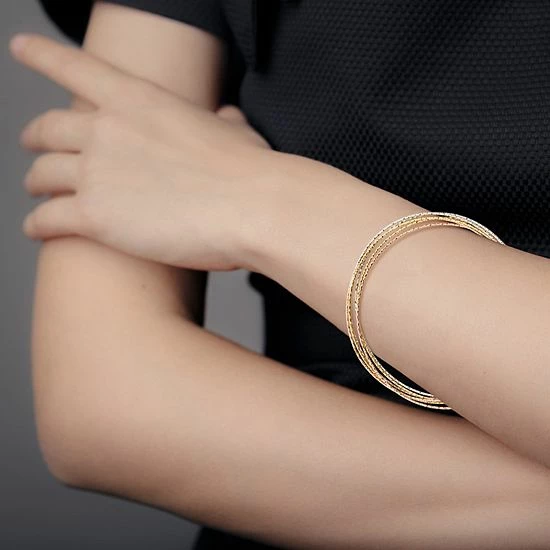 Add sparkling style to your ensemble with this tri-tone interlocking bangle bracelet.