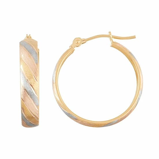 Enhance your ensemble with the timeless elegance of these tri-tone 10k gold striped hoop earrings.